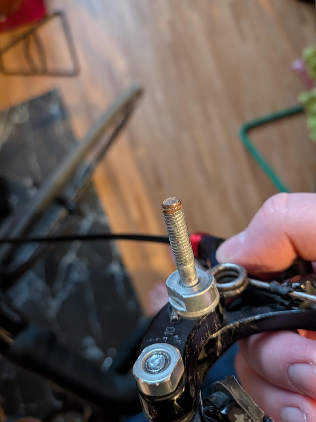 Wahrscheinlicher ist, dass das ne Mutter mit Innensechskant ist, die in der Bohrung im Rahmen auf den Stehbolzen in der Bremse geschraubt wird; der Innensechskant ist versifft, und daher nicht als solcher erkennbar.