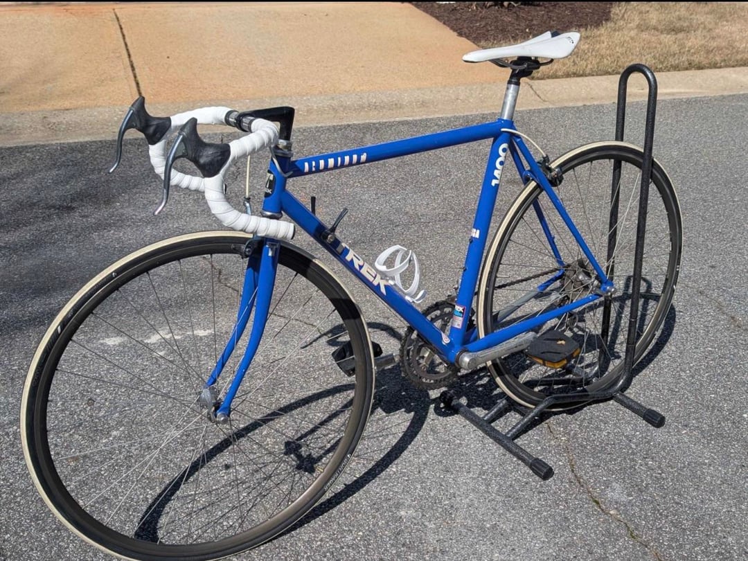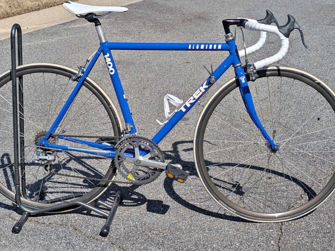 Classic 1994.Trek 1400 Aluminum road bike. Blue frame equipped with Shimano 105 components (2×7) and updated with white bar tape, saddle, cages, tires and pedals. For $500. Is this a good deal? by madrza Bicycle Bicycling Bike Biking Cycling Vintage Vintage Bicycles Vintage Bikes