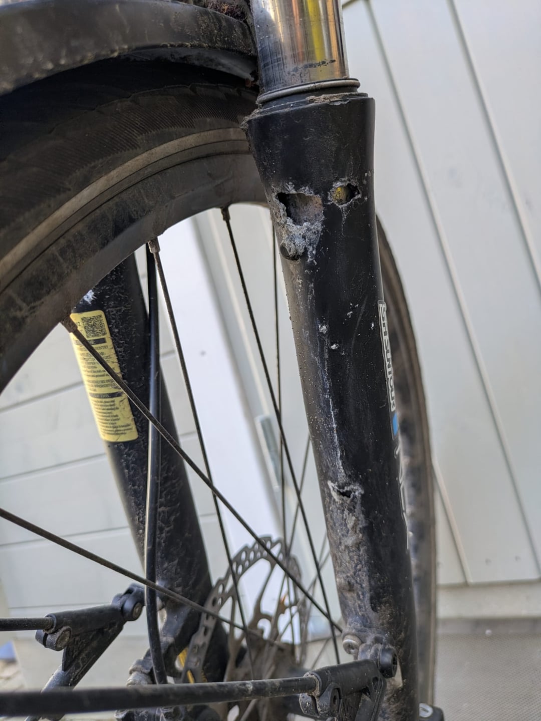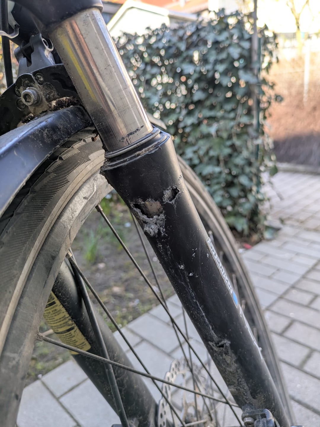 die beine sind vermutlich magnesium legierung, das salz im winter kam in einem kratzer rein. und ist buchstäblich weg gerostet. hier besteht lebensgefahr, nicht weiter fahren!