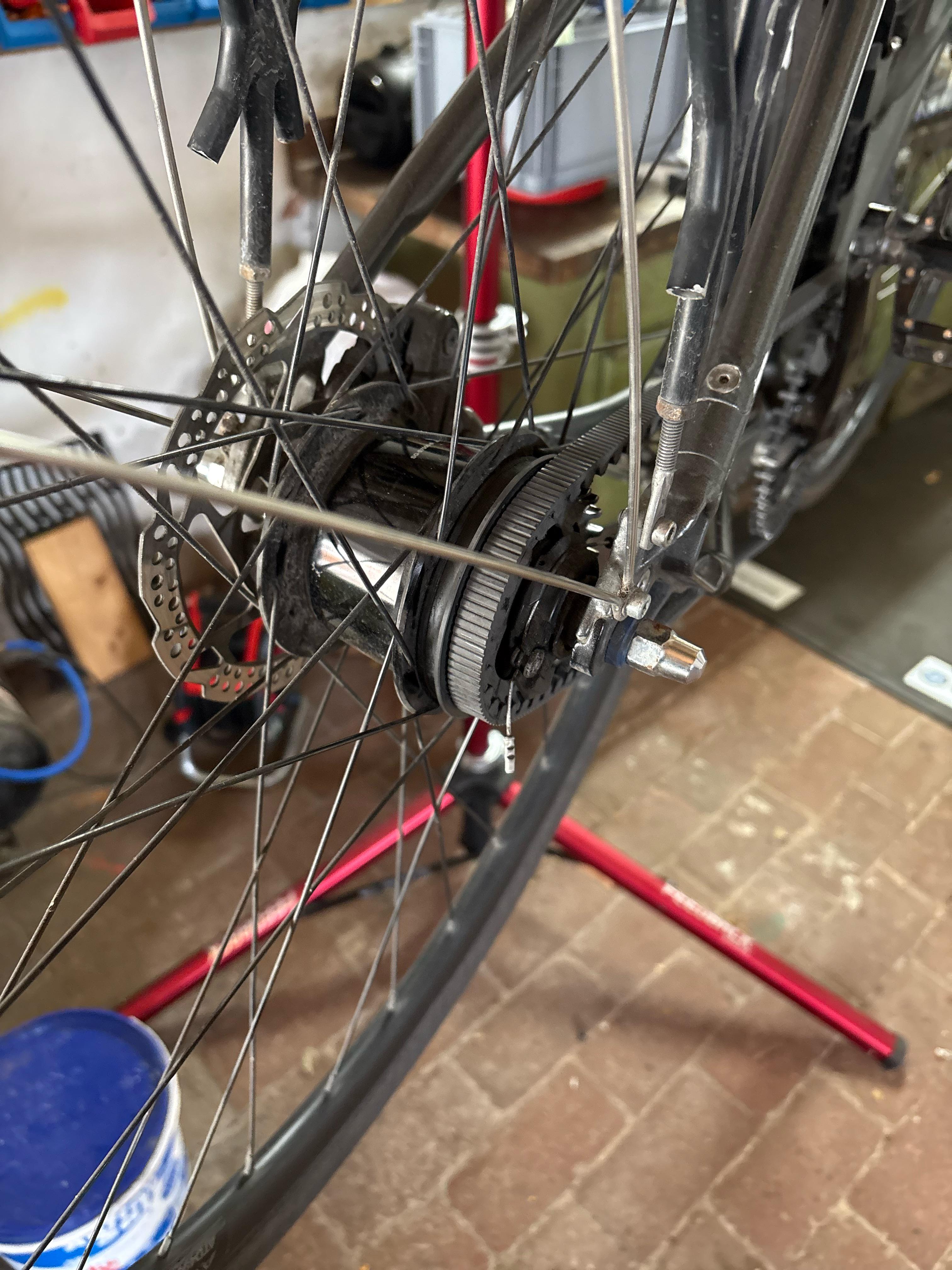 Dann löst du die Achsmuttern, hältst dabei das Hinterrad fest und senkst es etwas ab, um den Riemen vorsichtig runterzunehmen.