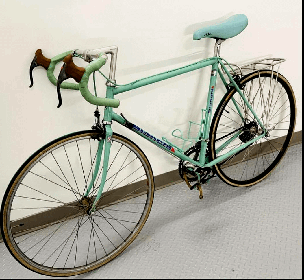 Look at the front brake housing. They raised the stem (likely beyond the maximum safe limit) without replacing the brake housing so the bar tape is unraveled and the housing pulled tight from the lever. The wheels don’t match (pretty common on a bike of this age). The front hub is filthy.