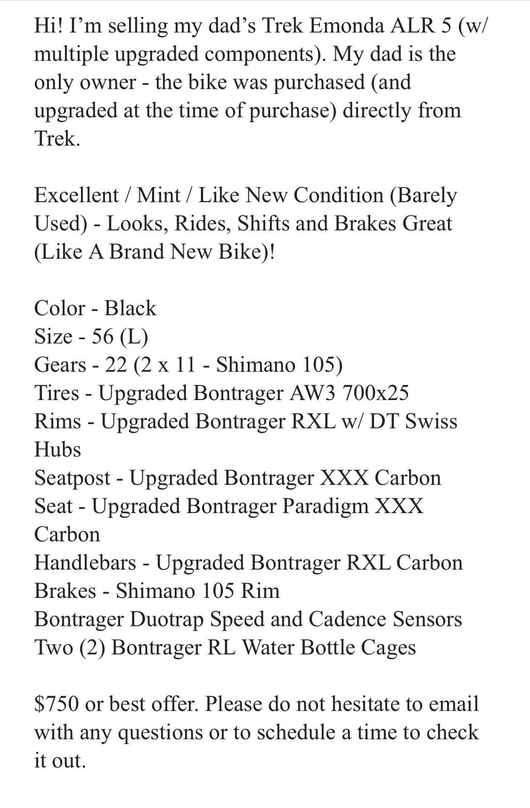 Hi! I’m thinking about buying this bike – 2016 Trek Emonda. I have ridden it, it fits perfect and works perfect. I had my LBS examine it, it is in excellent / mint condition with no areas of concern whatsoever. But…how much is it worth? Is $750 accurate or way too high for a 10 year old bike (even with all the upgrades)?