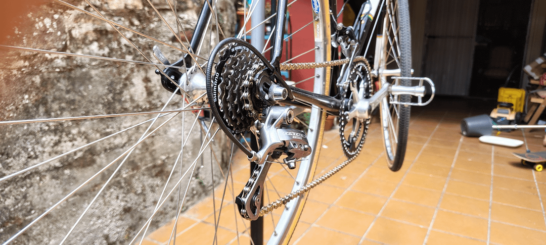 - The Simplex rear derailleur in some pictures one day decided to crack, so now is on a longer cage Campagnolo Centaur 10 speed (it was from a triple crankset) [picture 10]. As I got the bike with a Shimano generic rotary cassette with shorter gears, the short cage derailleur had some interference on the bigger cog during a swift shifting, cracking [picture 9]