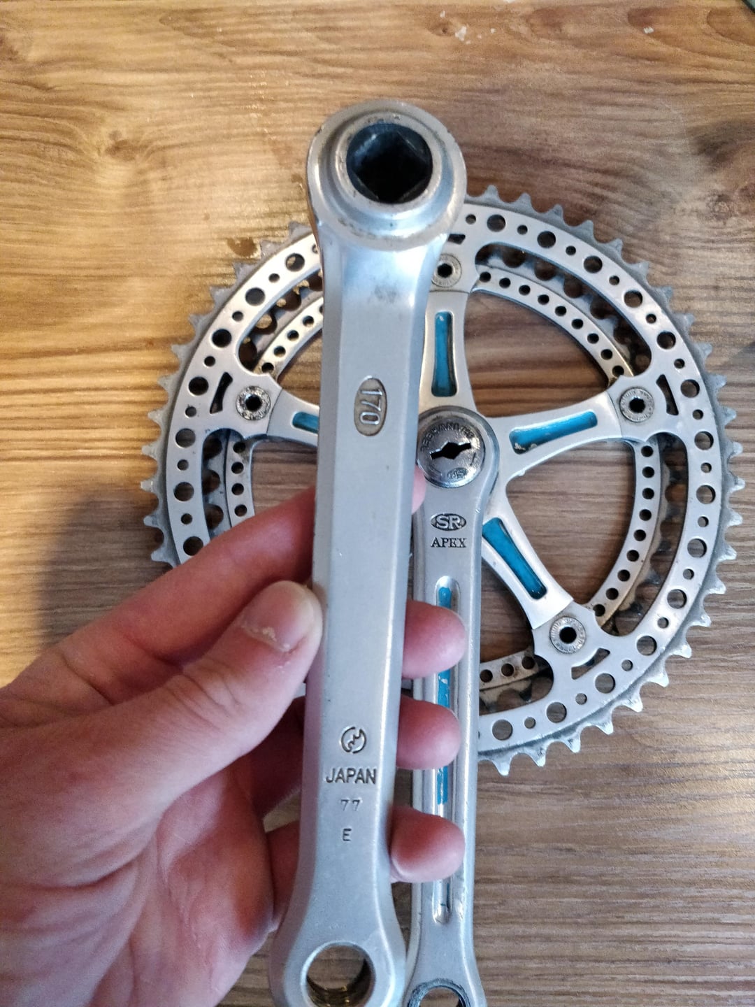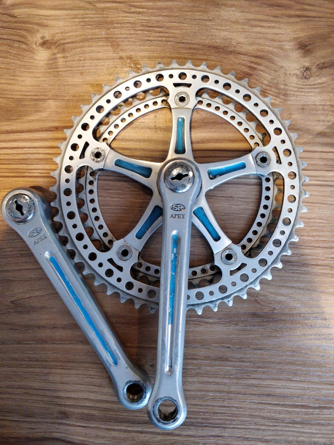 Picked up this lovely SR Apex crankset from a car boot sale for £4 this morning because I just fell in love, but does anyone know the specific model, as I cant find anything that mooks the same? my assumptions are that either the chainring were changed or drilled out?