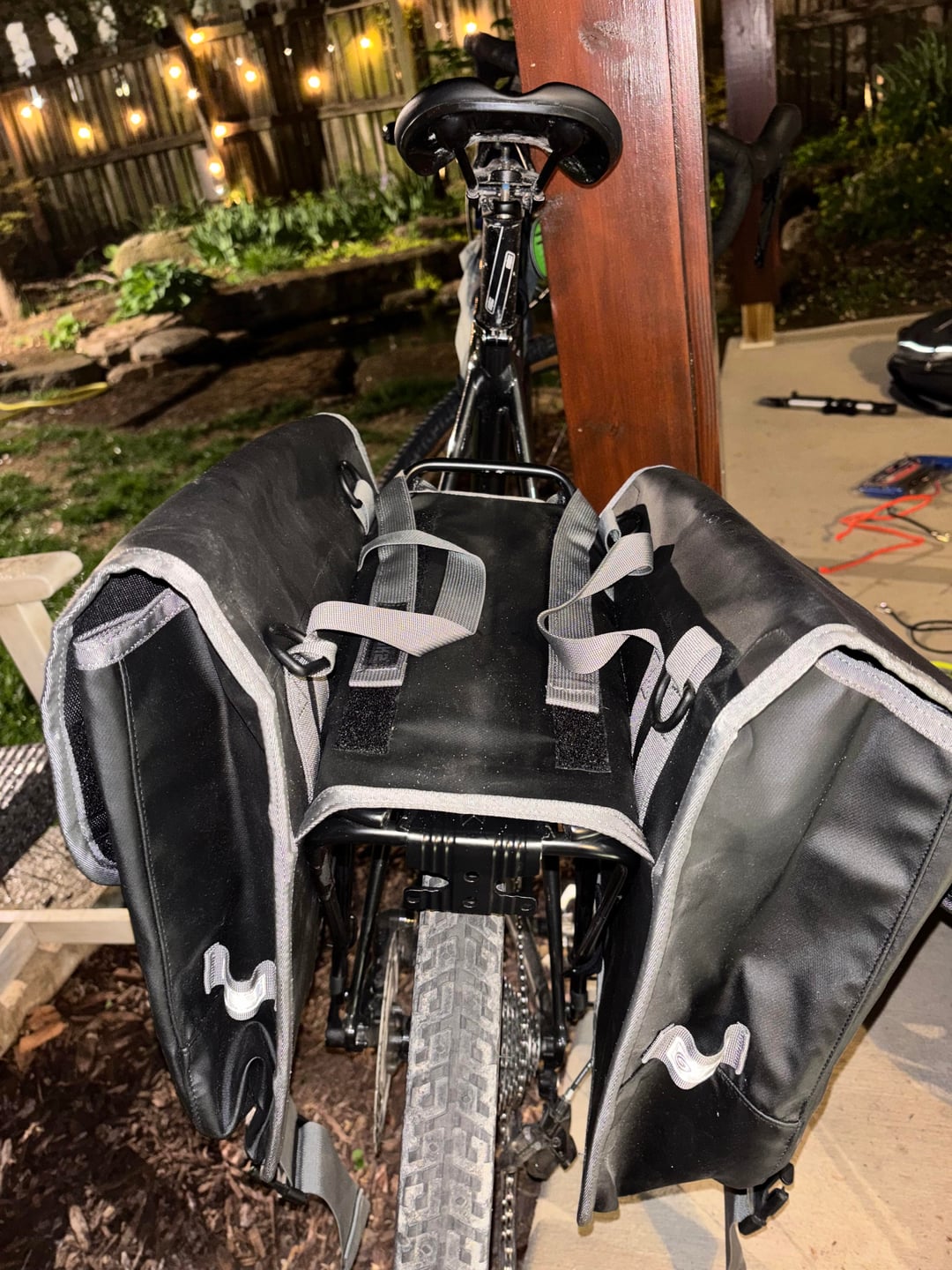 1st time bikepacking, what’s a convenient way to keep a large sleeping bag strapped down on top of these panniers? Bonus points if the solution keeps the sleeping bag safe from rain! by bigchipah Bicycling Bikepacking Biking Cycling