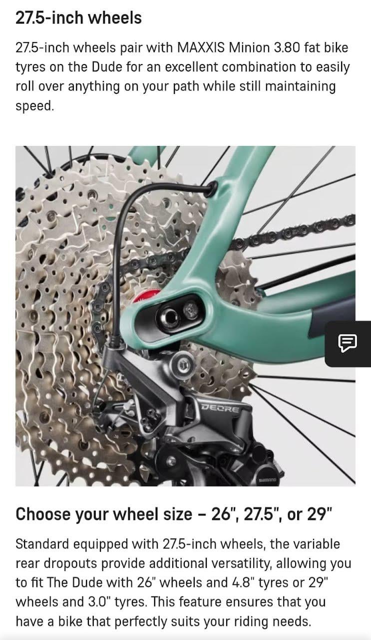 espressocycle on April 24, 2026 6:56 pm Looks like the bike comes with 27.5 x 3.8. 3.8 is already a summer width by modern fat bike standards. Probably you would want 29ers. It says you can go up to 3″ but a 29×2.8 would be cool.
