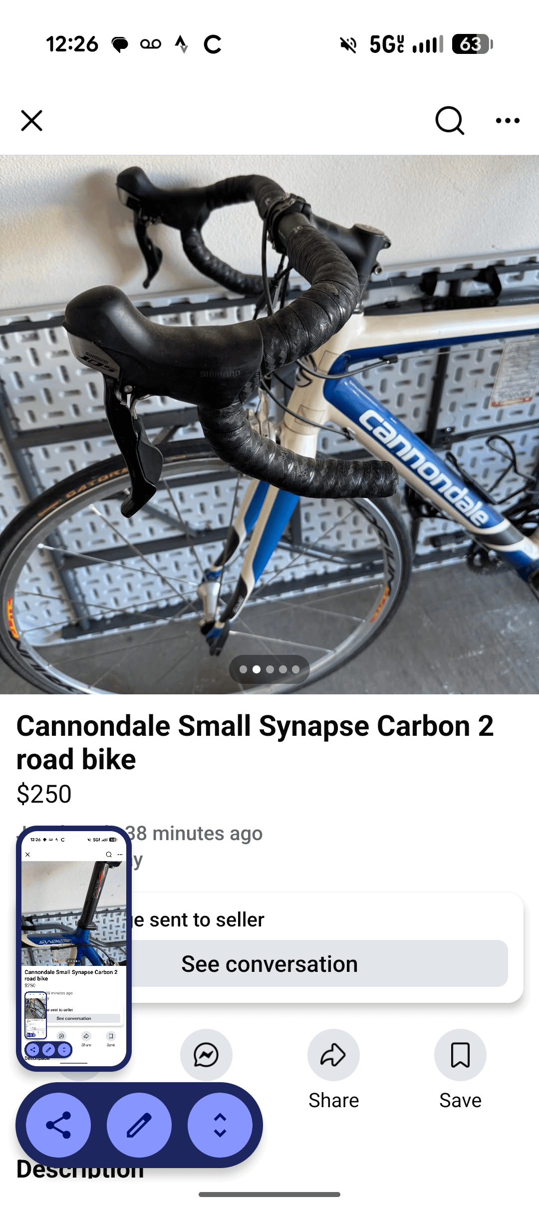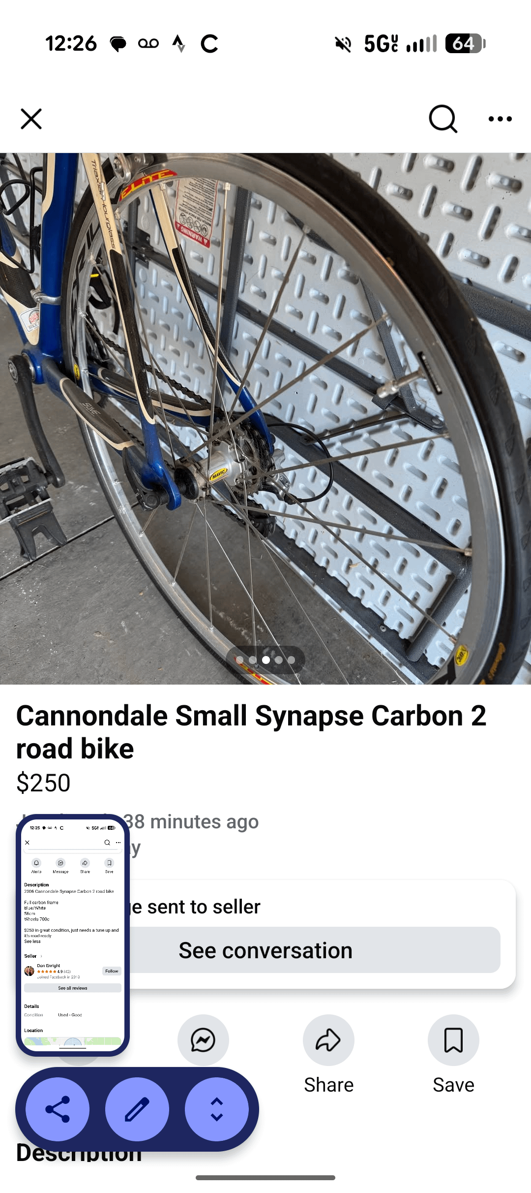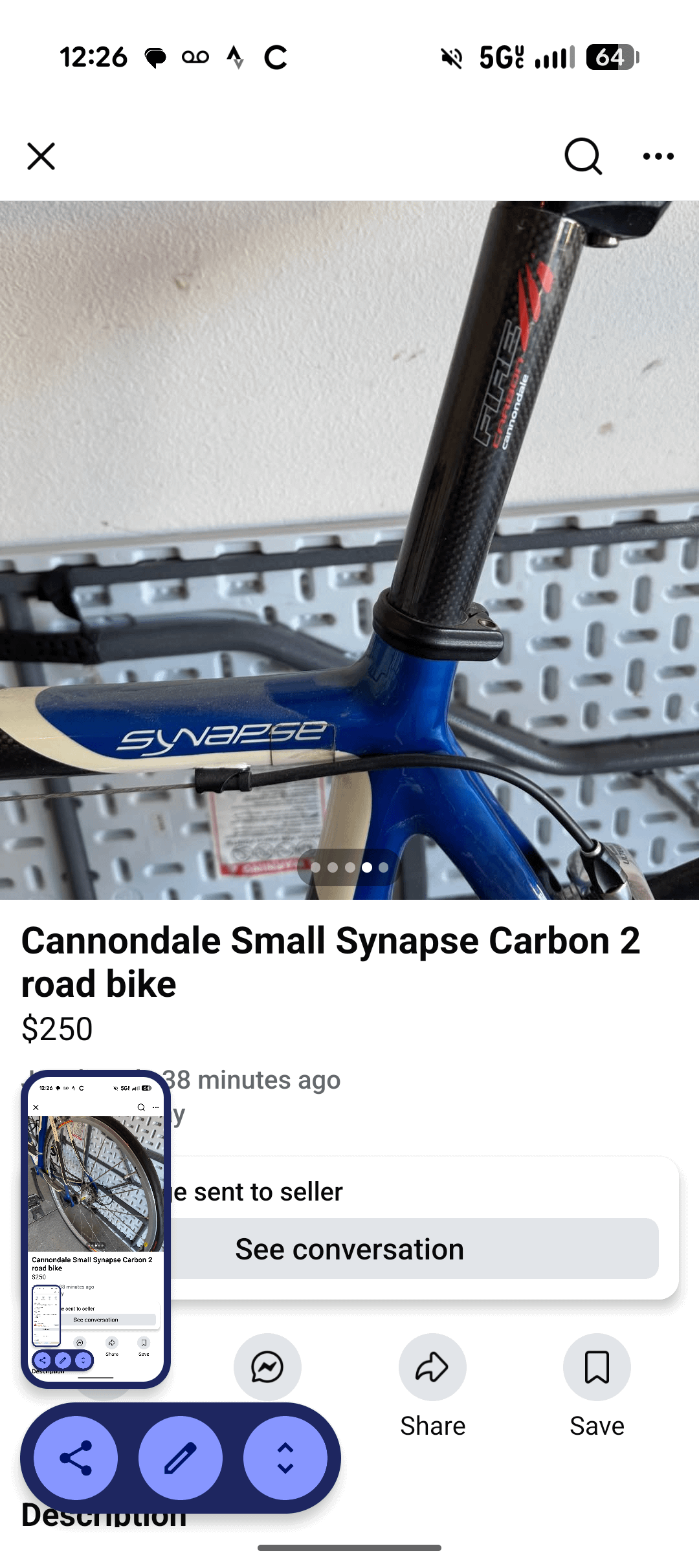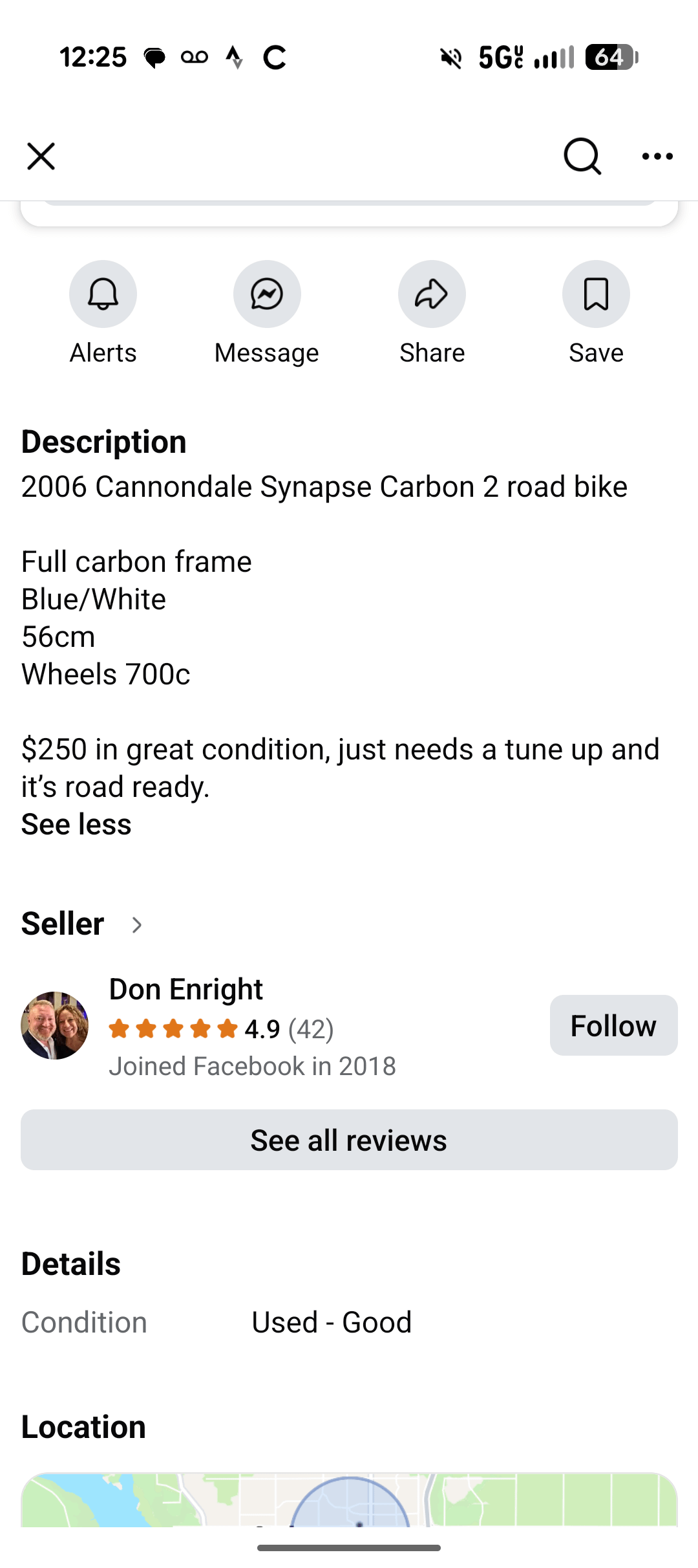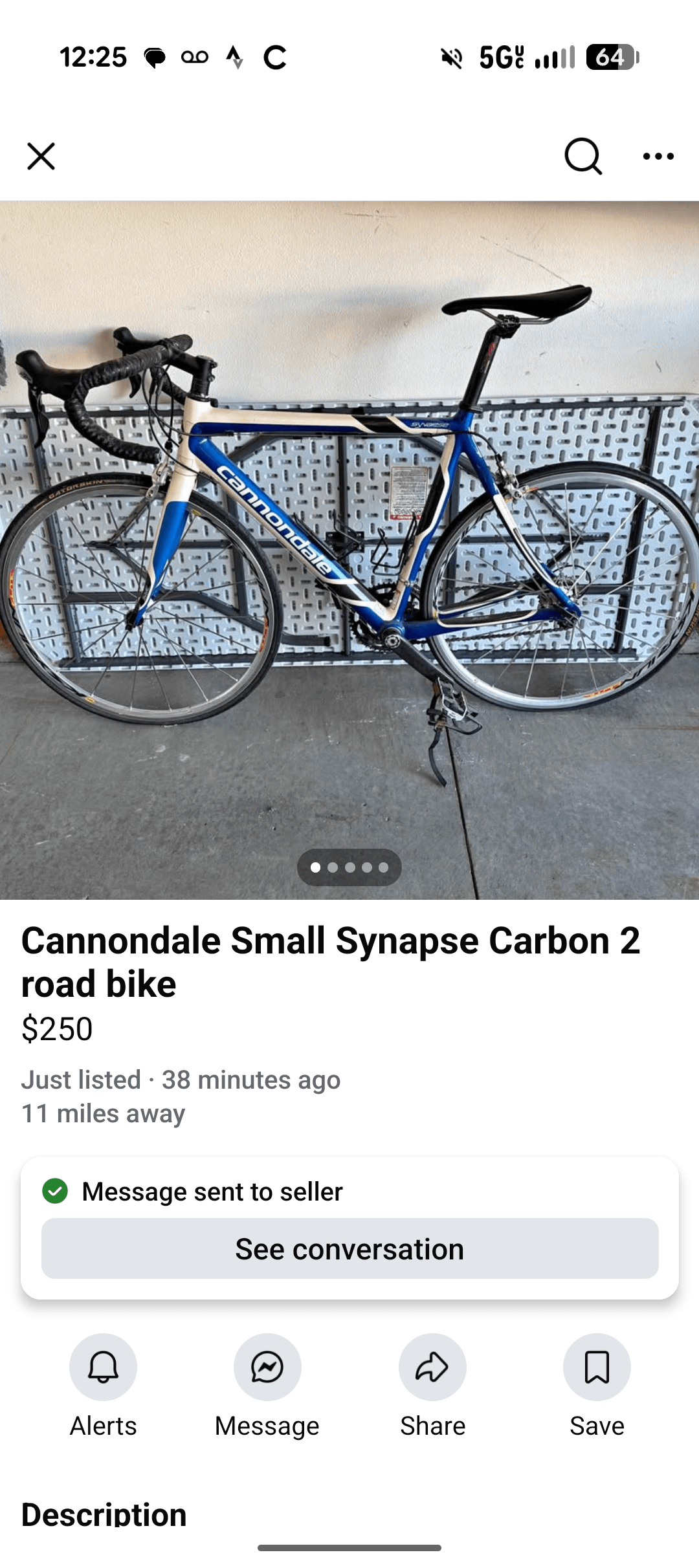 It is aluminum with a carbon fork dating from around 2010-2012. I can see the welds at the joints and Cannondale did not do curved seat stays in carbon frames. It is not a good commuter bike, fitting fenders will be difficult and it is not designed around carrying stuff. It can be used for longer rides. The price is about expected. If it fits you it is worth a look, height around 6′.