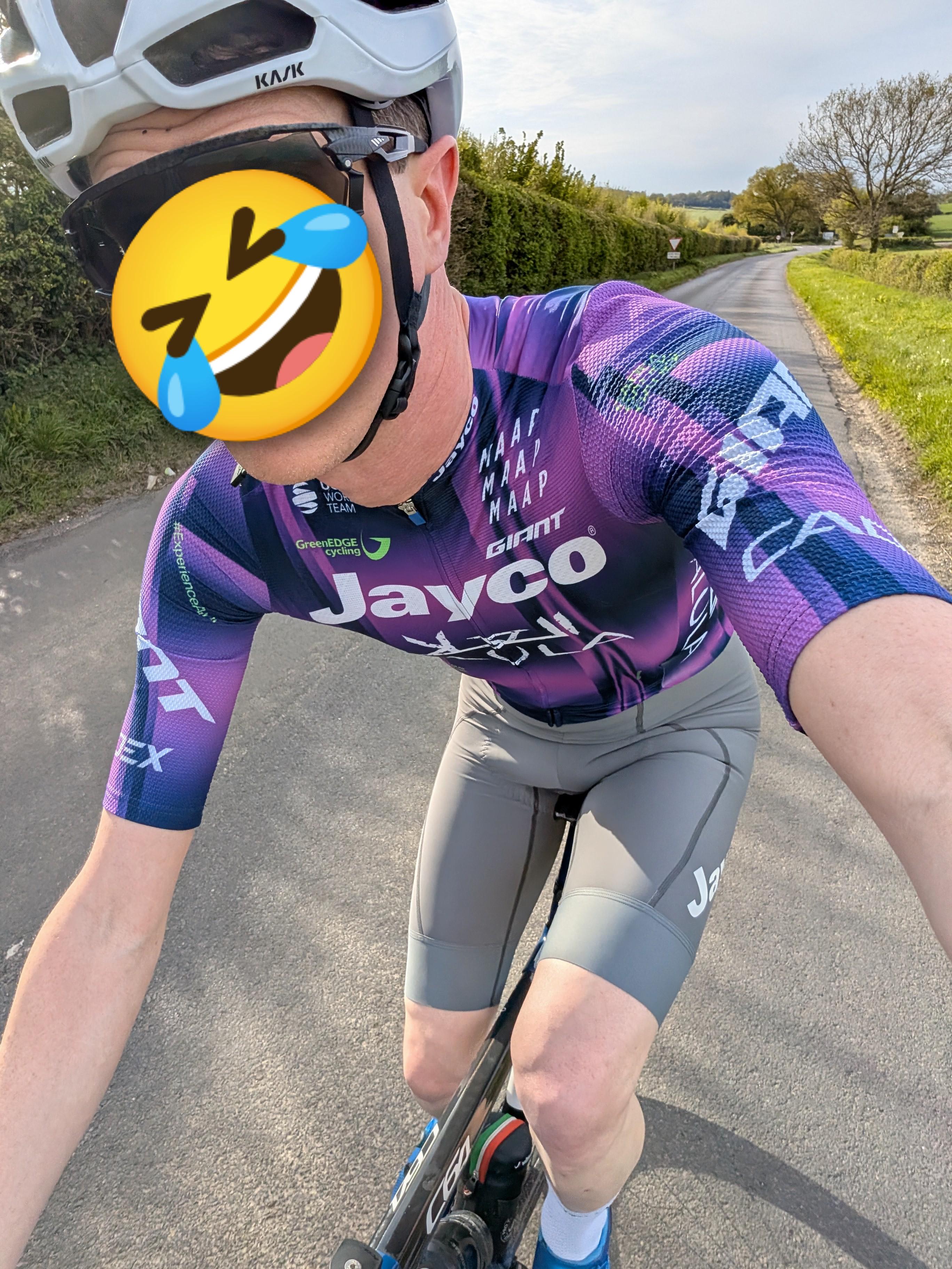 I liked the purple and grey scheme, and grabbed a skinsuit in medium when one appeared at the right price. Was brand new in bag, and fits me pretty well. Size medium, I'm 183cm/65kg. Made in Italy. I don't know if it was customised for the rider (Michael Hepburn) but it feels like it's cut pretty long for a medium. They are 3cm taller and 10kg heavier than me. Glasses are prescription Zunnies with Transitions lenses, and thoroughly recommended.