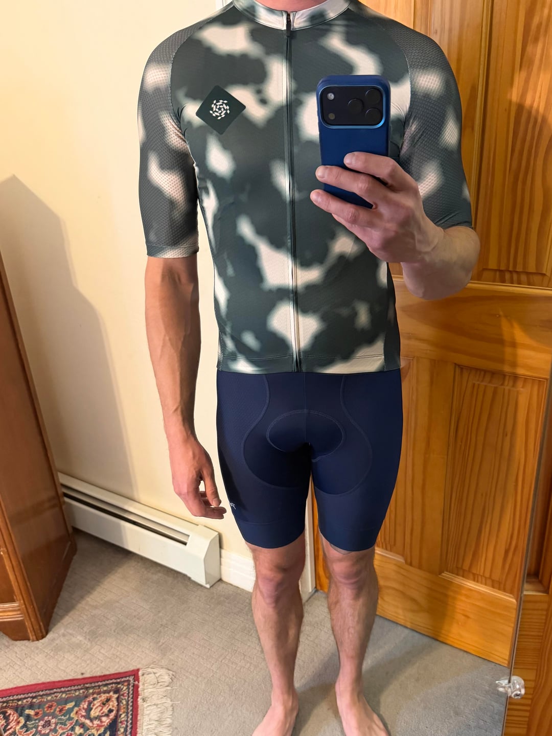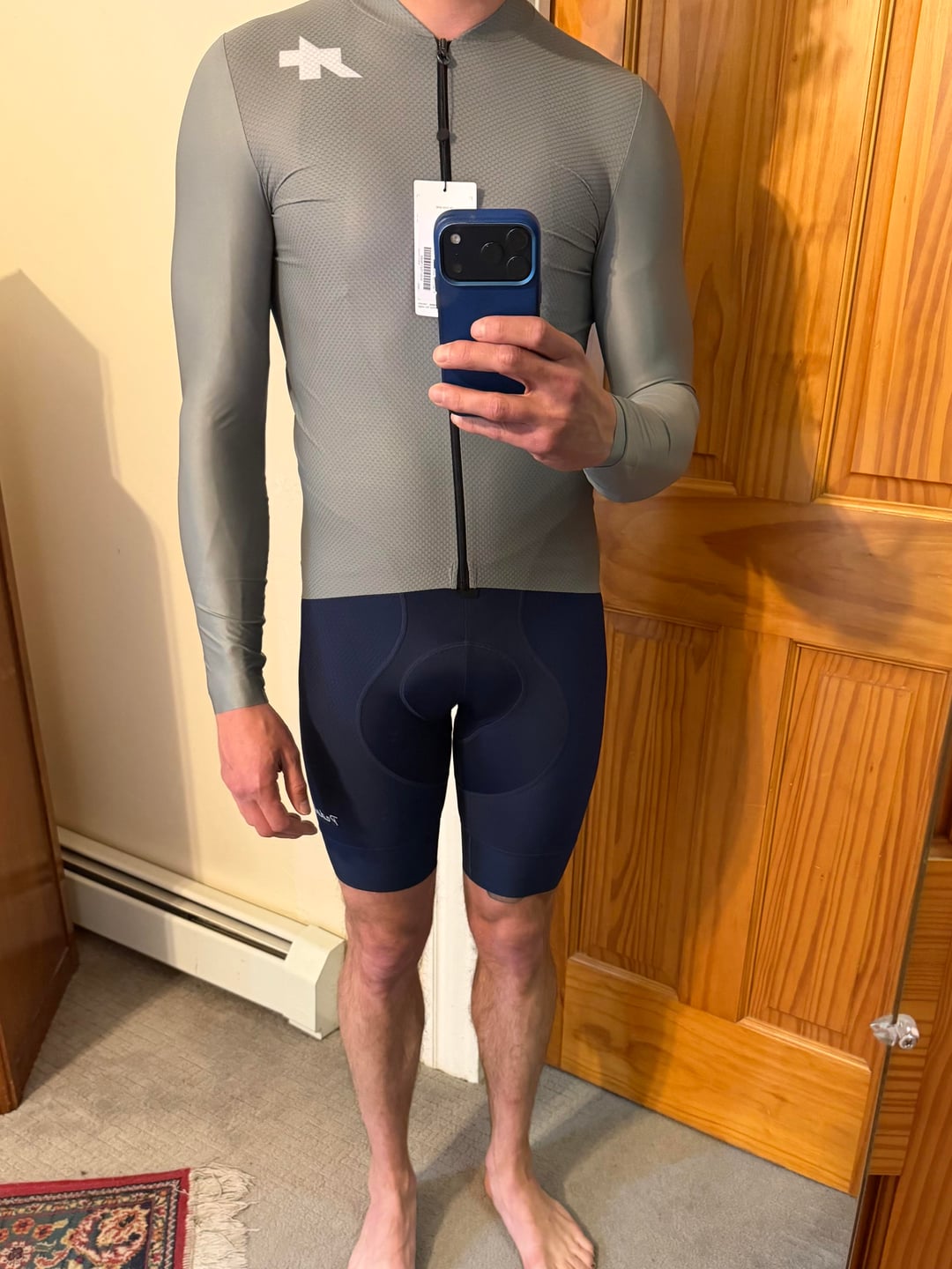 The Assos top looks like it might be a tiny bit loose, but hard to tell. Definitely wearable, but not race-fit tight. The biggest thing that’s throwing me off there is honestly the shoulders. Unlike normal menswear, the shoulder seam in cycling tops tends to be more inset, like if you were wearing a T-shirt 1-2 sizes too small. (See this model: https://www.reddit.com/r/CyclingFashion/comments/1sw01r4/sizing_advice_experience_with_pns_speedsuit.) It looks like you might have tugged down the shoulders to where you think is “comfortable” in your normal frame of reference, and that could be skewing the rest of the fit — making the arms seem long and potentially masking some looseness in the top. Just my guess on that, but if that is the case, see what it fits like with the shoulders in the correct position, and it might either reveal some more awkwardness or get rid of the awkwardness I’m picking up on.